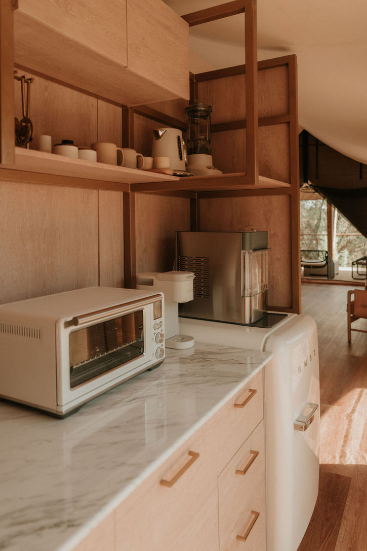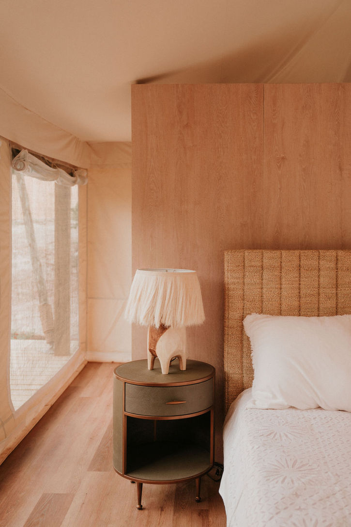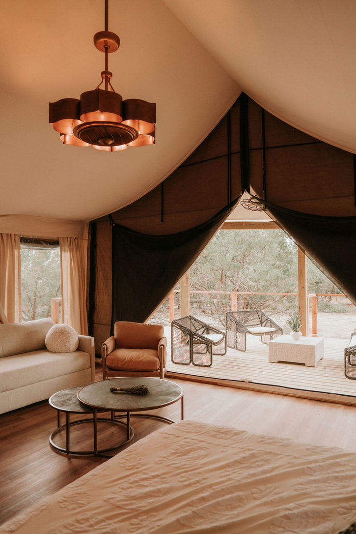 We seek to provide sanctuary-style accommodations. Our 6 luxury-style tents are furnished with hand-picked, high-end pieces that are both locally and globally sourced. The use of textures, historical patterns in earthy tones, local woods + tones from nearby quarries, and artisan touches combined to create a warm, sophisticated, eclectic space.